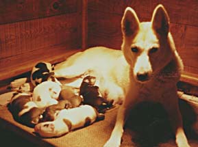 KARCAJOU'S DREAMA OF WINDIGO, born in 1983 and bred by Deborah Serbousek, was chosen as foundation bitch for the Bragg-Boucher partnership's return to Seppala breeding in 1990. A 35-pound sable female, she was bred in Germany to HERCULES OF SEPP-ALTA. |