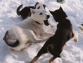 MAGICK OF SEPPALA (Sepalleo x Zirconia of SA) plays with TONYA's pups MOKKA (foreground) and MARAQ (background). MAGICK was the favourite 'auntie' of most litters at Seppala Kennels.