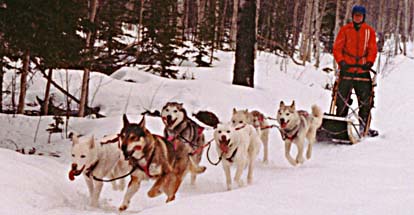 TONYA OF SEPPALA and SEPALLOP are shown here in April 1997 bringing home a team that includes 5 progeny of SHAKAL IZ SOLOVYEV, driven by J. Jeffrey Bragg.