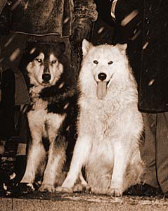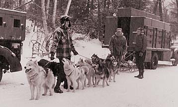 FOXSTAND'S SHAMUS stands waiting to go as the snow falls on a New England side road. Little known today, the piebald long-coated SHAMUS, sired by JEUAHNEE OF COLD RIVER, was Bill Shearer's main leader in the early 1950s.
